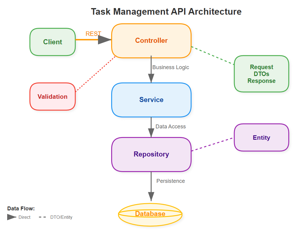 Think of Kubernetes' API server—every pod, service, and deployment is managed through REST endpoints. Your Task Management API follows the same principle, becoming the single point of truth for task lifecycle operations.